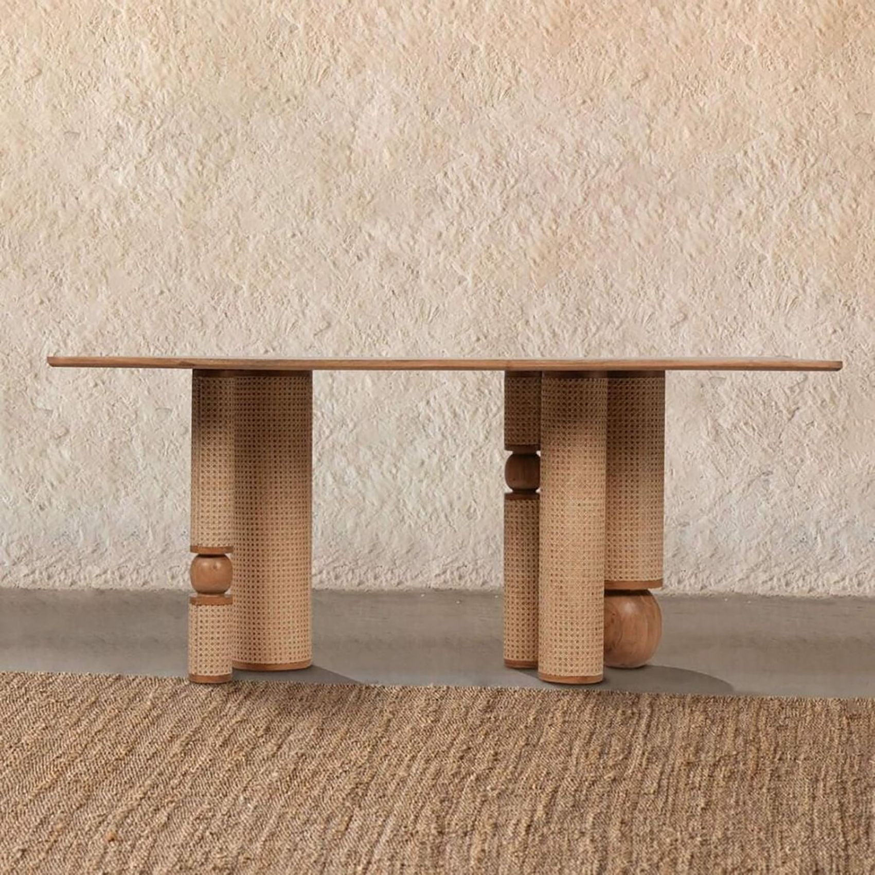 | Chất liệu | Chân gỗ tần bì, mây nhựa decor, mặt gỗ hoặc đá ceramic chống thấm ố, chống trầy xước. |