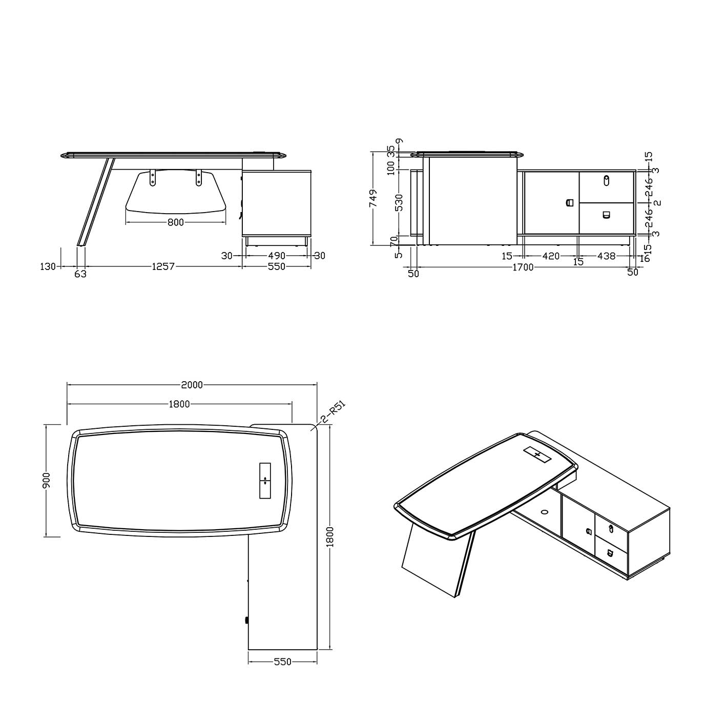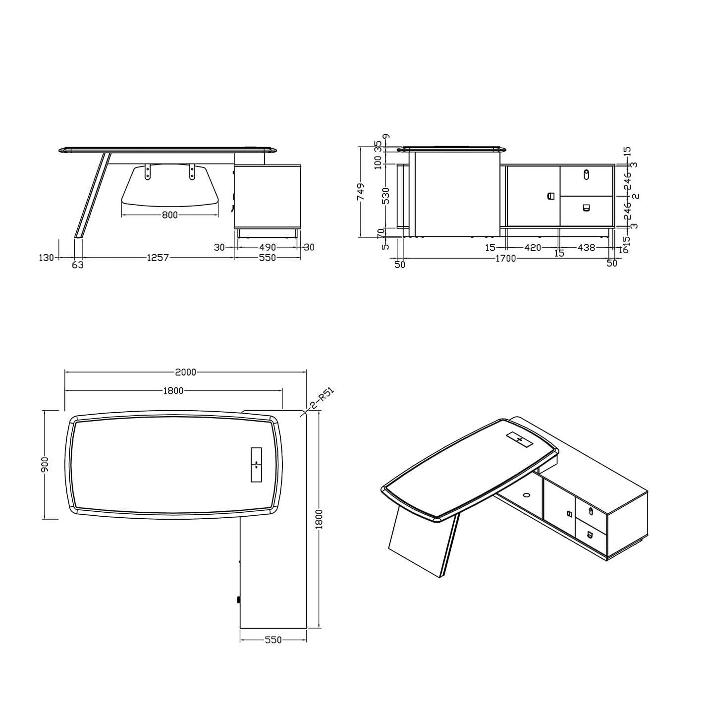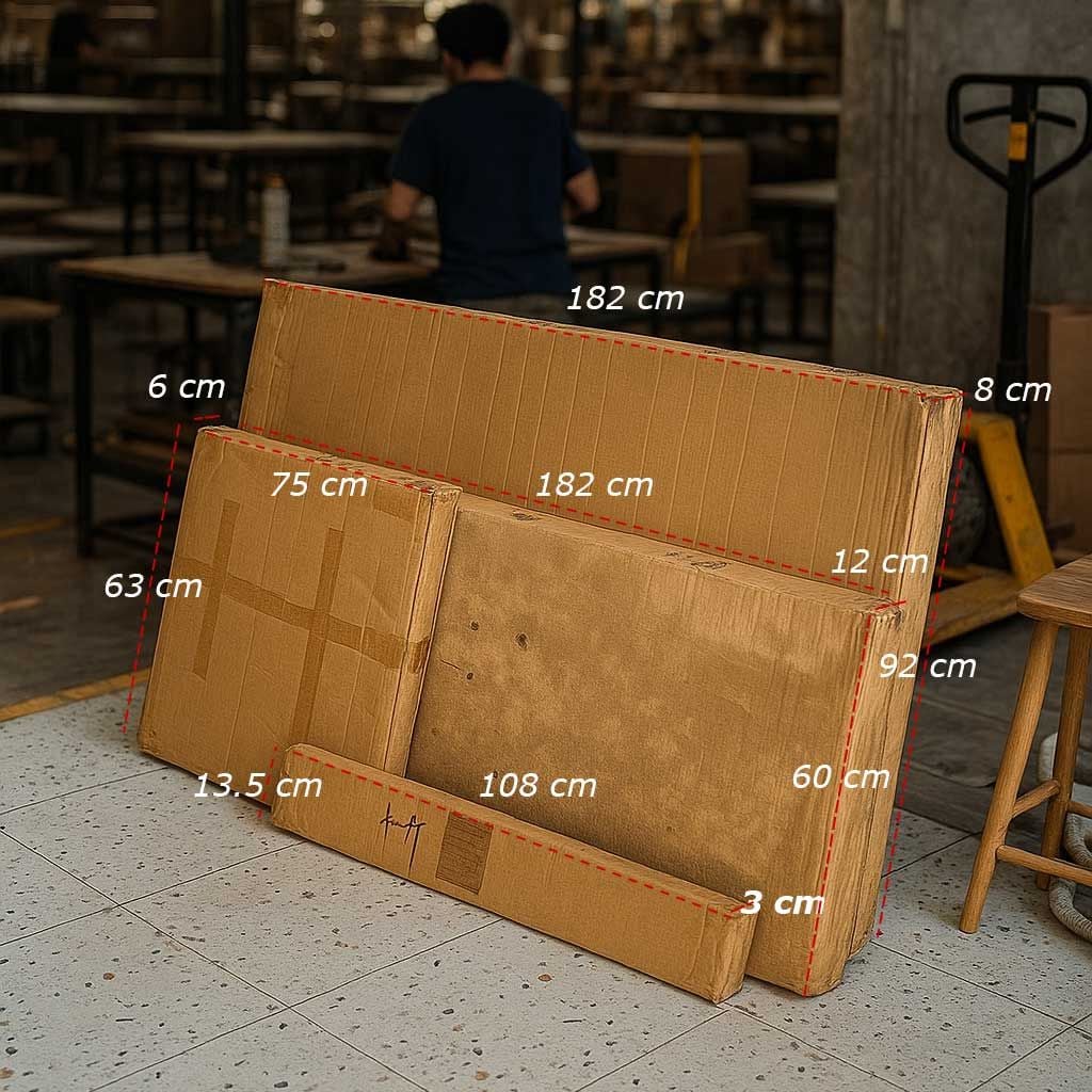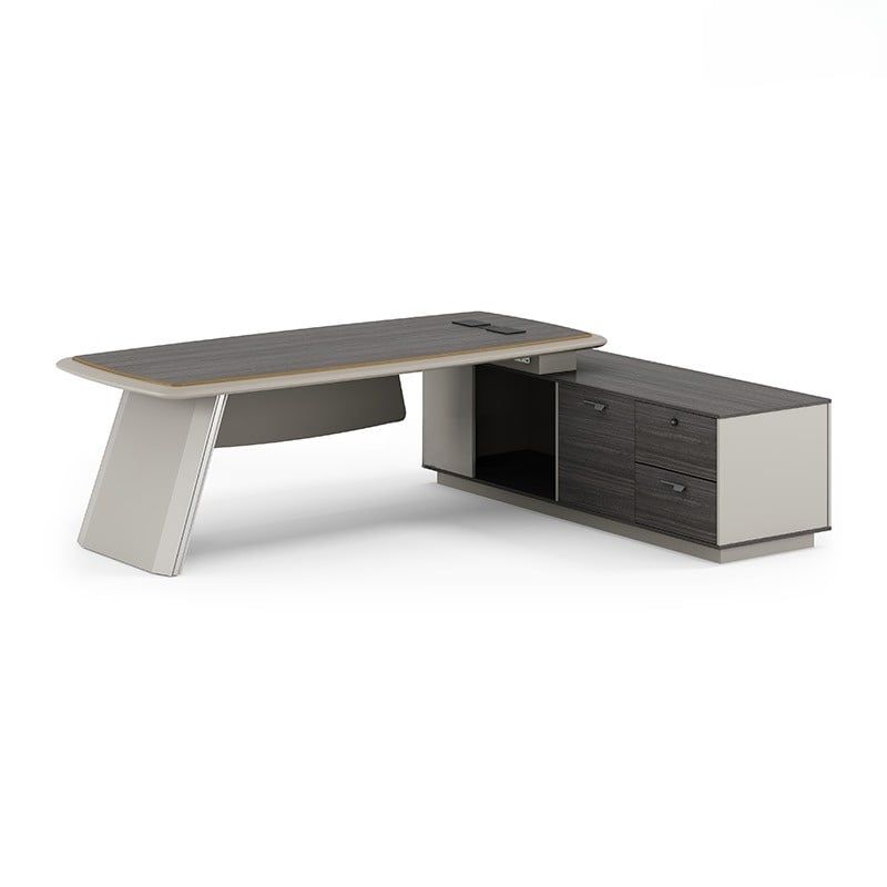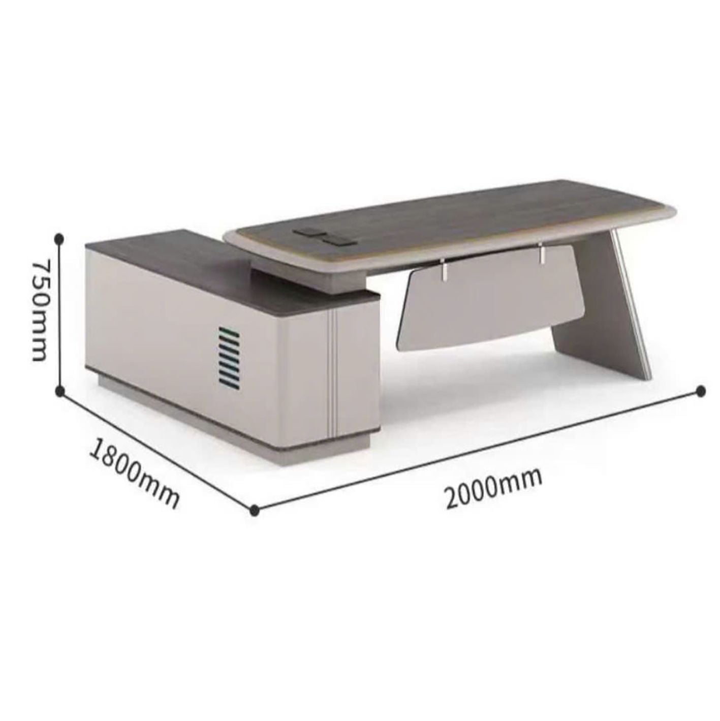 Mặt bàn rộng 2000 mm, sâu 1800 mm và cao 750 mm, được chế tác từ gỗ MDF tiêu chuẩn E1 dày 5cm, xử lý chống thấm và sơn ngoại vi hai màu, mang lại vẻ chắc chắn cùng tính thẩm mỹ vượt trội. Tủ phụ và khung chân đồng bộ sử dụng ván ép nguyên khối và MDF phun sơn chống thấm, kết hợp phụ kiện cao cấp như ray dẫn hướng ba đoạn 14 cm, tay nắm kim loại, khóa mật mã — tất cả tạo nên một tổng thể hoàn hảo cho không gian lãnh đạo.