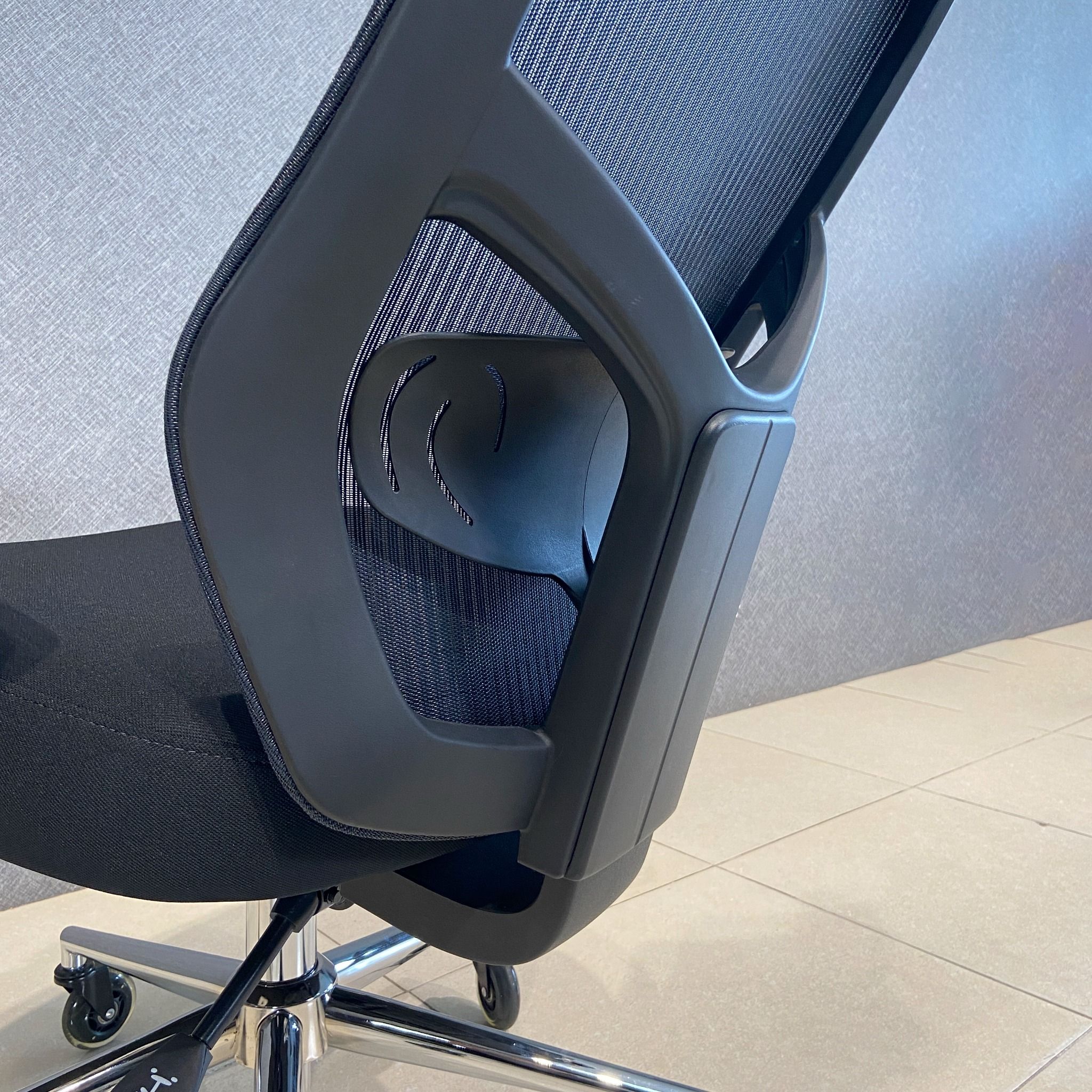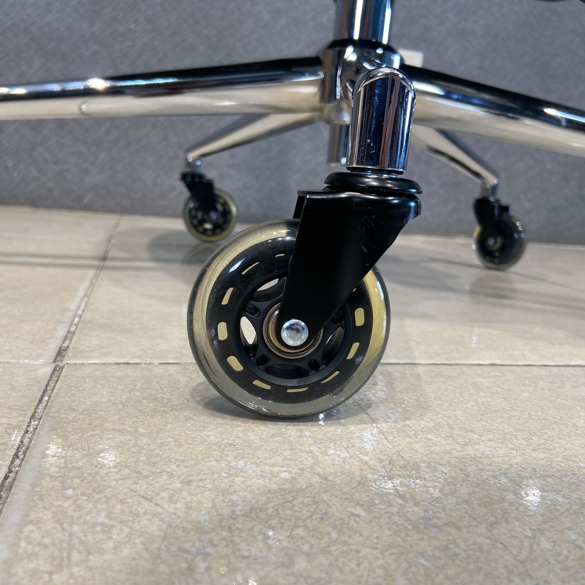 Chất liệu : Khung làm bằng nhựa, bánh xe nhựa đúc. Mặt ghế nệm bọc vải sợi tổng hợp, lưng tựa, đầu vải lưới.