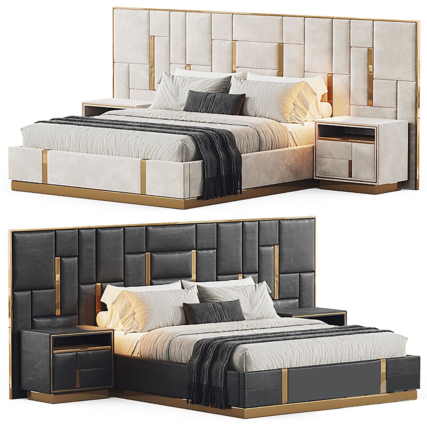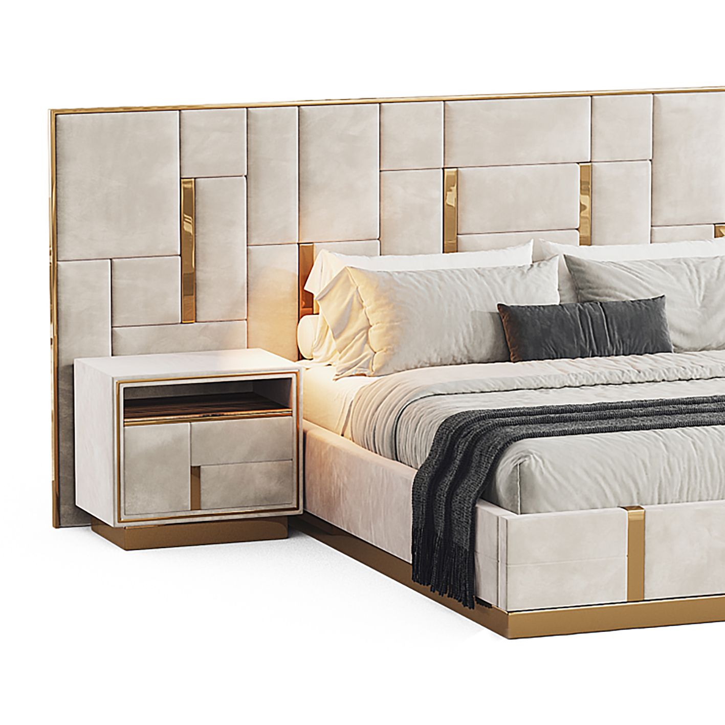 Regalia Bed là một tuyên ngôn đẳng cấp dành cho không gian nghỉ ngơi. Với thiết kế đầy ấn tượng lấy cảm hứng từ kiến trúc hình khối hiện đại, mẫu giường này chinh phục khách hàng bằng sự kết hợp tinh tế giữa các đường nét hình học mạnh mẽ, lớp bọc cao cấp và những chi tiết mạ vàng sang trọng.